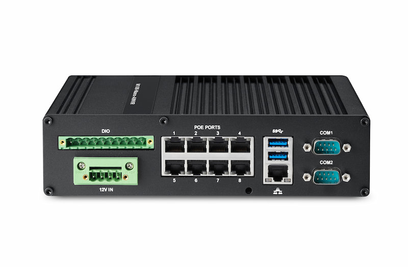 The DLAP-301-Nano provides a wide variety of industrial I/O and visual inferencing capabilities in a compact size including eight ports of Power over Ethernet (PoE) for video streams, one HDMI display output, one GbE port, three USB 3.0 ports (plus a USB 2.0 OTG port for software updates), two COM ports, 8-bit GPIO, one 2.5” SSD drive for additional storage, and a Mini-PCIe slot and USIM socket to support wireless communications such as Wi-Fi, LoRA, and 3G/4G LTE.