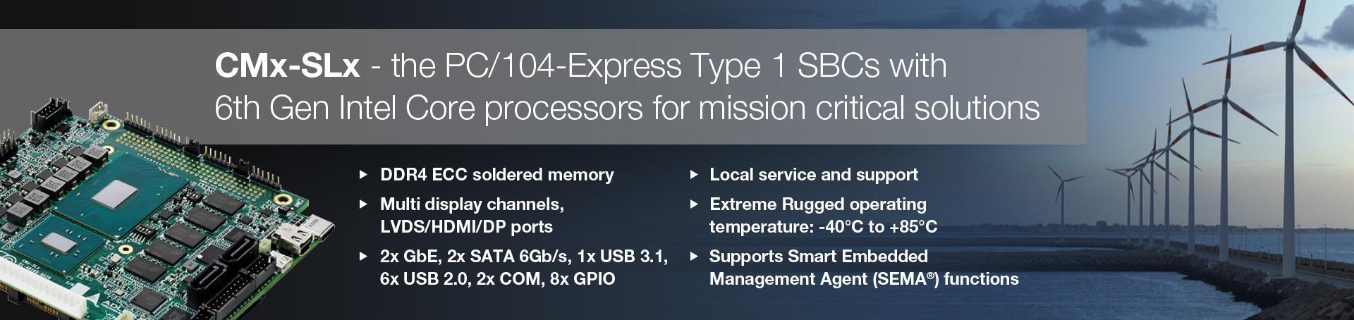 An excellent implementation of powerful processing and high-speed I/O in a PC/104 module is the ADLINK CMx-SLx PCI/104-Express Type 1 single board computer, based on the 64-bit 6th-generation Intel® Core™ i3 processor (formerly “Skylake H”). The CMx-SLx is specifically designed for customers who need high-level processing and graphics performance in a long product life solution and leverages Intel® HD Graphics and DDR4 memory for optimum graphics and I/O performance for today’s video-intensive data traffic applications.