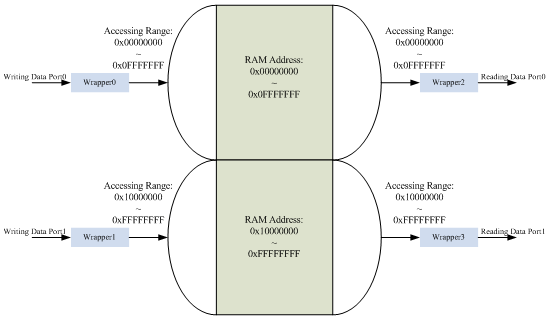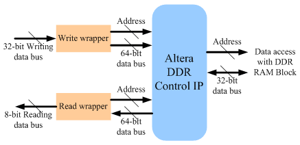 Each wrapper contains a small FIFO, a packing/unpacking mechanism, and an address progression counter. The FIFO is used to adjust the different settings between the user interface and DRAM clock domain. The packing/unpacking mechanism is used to regulate the input/output interface bus width to correlate with the DRAM control IP interface to effectively write and read DRAM data. The address progressive counter is the DRAM address generator for each wrapper. When the counter number written to the wrapper is greater then the counter read from the wrapper, the data to be read must be legal data already written to the DRAM, or else the incorrect data will be accessed.