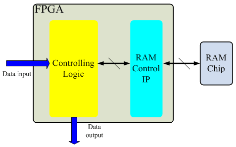 Most high-capacity data processing applications require a large amount of data registers. Yet for the price of a 4 kB FIFO, 32 MB DRAM chips can be purchased; offering more than ample memory space. However, as mentioned, access control for DRAM is quite complex. The HDL calculations to write to a FPGA can only be done by the manufacturer's proprietary IP. Figure 2 shows the proprietary DRAM control IP within a FPGA.