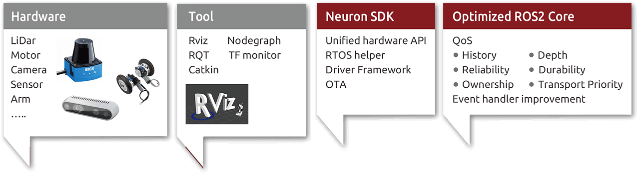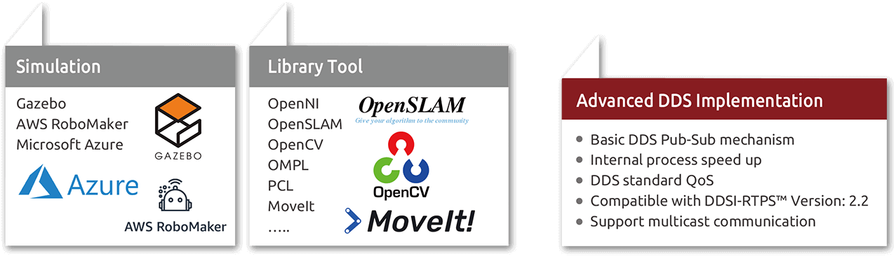 Rich tool/module portfolios and ROS/ROS 2 compatible environment make it easy to integrate application requirements across multiple hardware, software package, and service types.