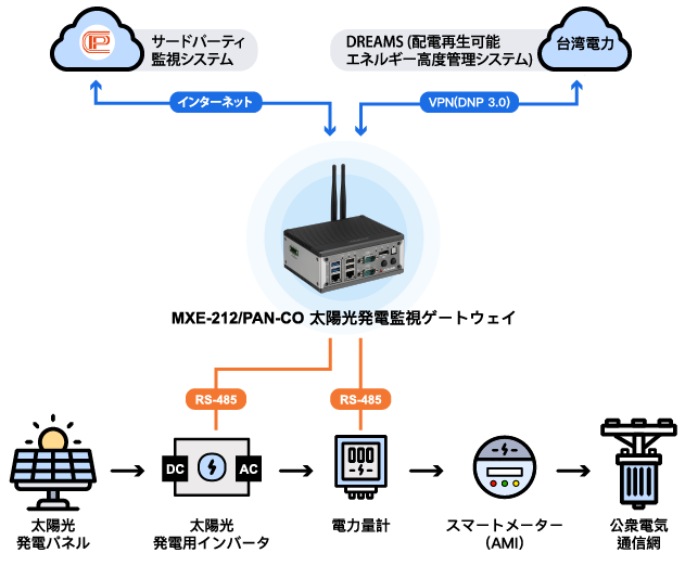 PAN-COは、ADLINKのMXE-210シリーズ産業用IoTゲートウェイに基づいてPV-DREAMS太陽光発電監視システムを構築し、特許取得済みの遠隔監視ソフトウェアを実行します。100kW以上の太陽光発電所向けに設計されており、台湾電力や国家通訊伝播委員会(台湾の国家通信委員会)の要件を満たしています。PV-DREAMS太陽光発電監視システムは、台湾電力会社のDREAMSシステムに接続し、太陽光発電の発電状況を7x24で遠隔監視することができます。これにより、迅速なトラブルシューティングが可能となり、発電ロスを低減することができます。