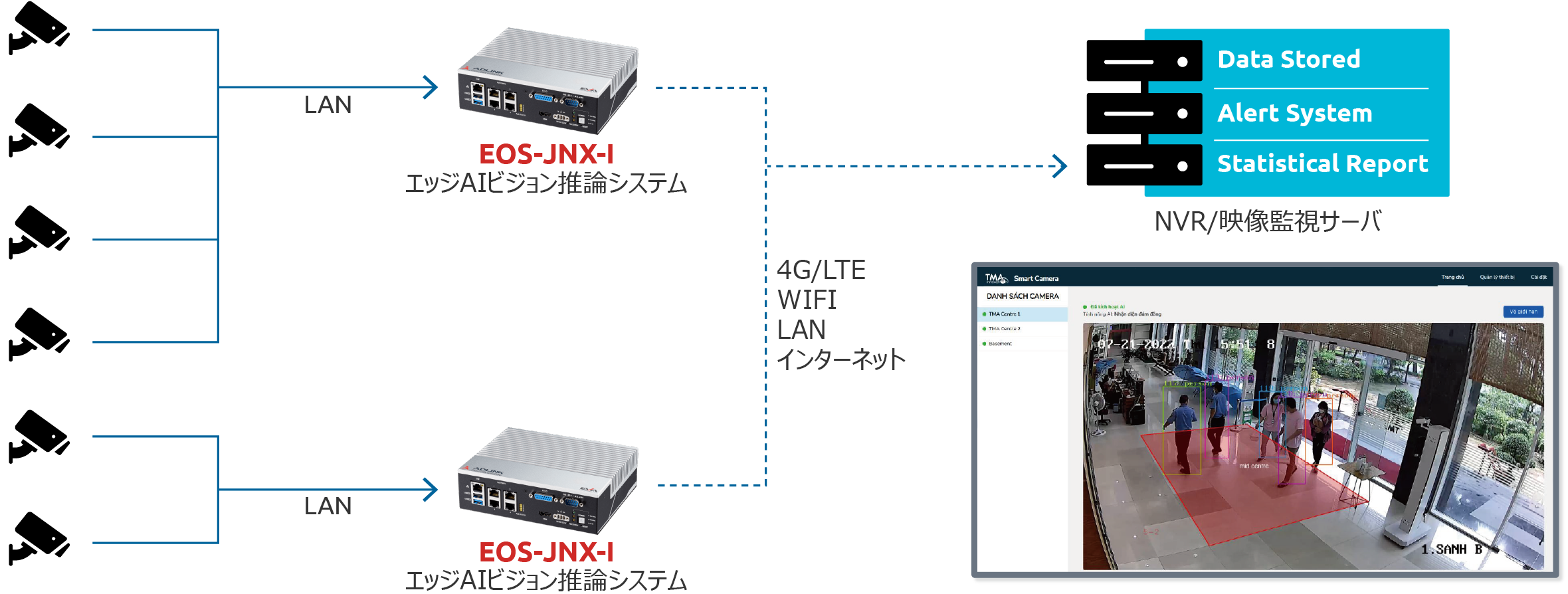 監視映像ストリームはエッジでEOS-JNXにより解析されるため、クラウド上のAI推論サーバへの映像伝送が不要となり、ネットワーク負荷が軽減されます。