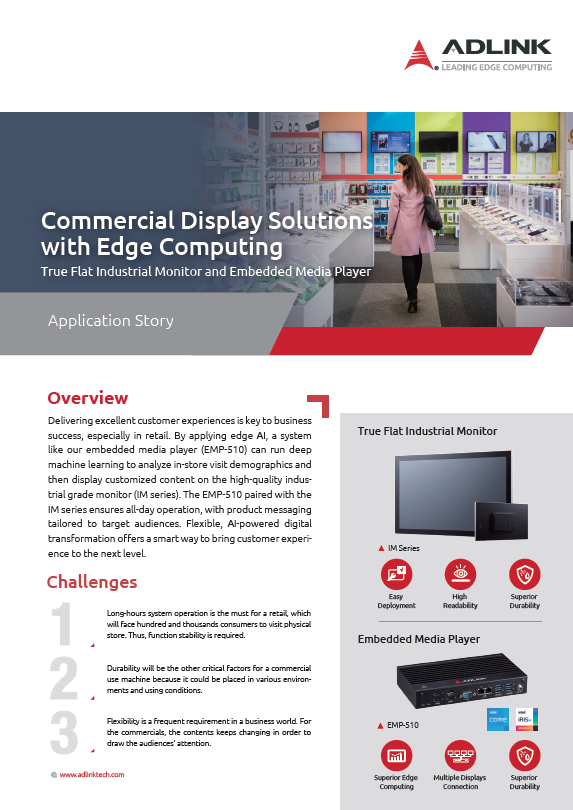 소매 및 인포테인먼트 산업을 위한 완벽한 솔루션인 에이디링크의 엣지 AI 임베디드 컴퓨터 및 미디어 플레이어는 더 많은 유동객의 이목을 집중시키고 비즈니스 효율성을 향상시킵니다. 이 엣지 AI 임베디드 컴퓨터의 몰입형 비주얼은 눈길을 끌기 위한 프로모션 콘텐츠에 이상적입니다. AI 기반 컴퓨터 비전 및 비디오 분석은 높은 관람객 수 및 비즈니스 통찰력을 보여주며, 소매업체는 엣지 AI 임베디드 컴퓨터 및 미디어 플레이어를 통해 판매 전략을 조정하여 수익을 높일 수 있습니다. 이 팬리스 소형 디바이스는 디스플레이 뒷면에 쉽고 눈에 띄지 않게 설치할 수 있어, 보이지 않게 높은 성능을 발휘합니다.