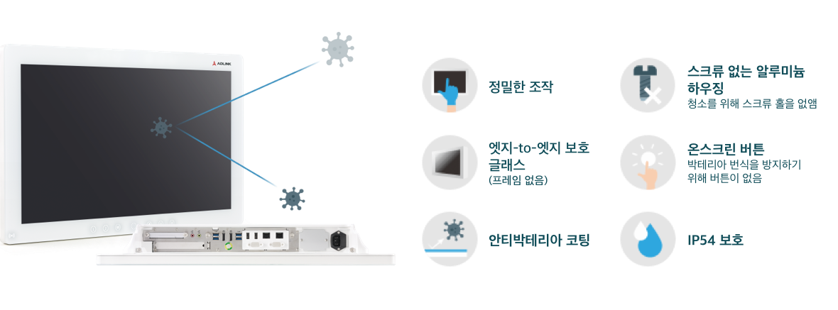 터치 인터페이스가 적용된 에이디링크의 메디컬 패널 컴퓨터의 일체형 디자인은 의료진이 작동하기에 편리하다. 기계 전체에는 나사, 틈새, 직각 모서리가 없으며, IP54 프로텍션, 360도 항균 페인트 코팅이 되어있어 소독과 세척에 편리하다. 그것은 또한 병원들이 전염병을 퇴치할 수 있도록 돕는다.